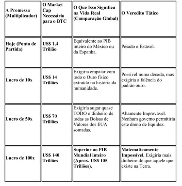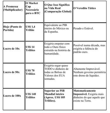Para que o Bitcoin atinja os US$ 140 Triliões necessários para dar um lucro de 100x ao pequeno investidor, esse dinheiro teria de ser drenado de algum lugar. Significaria o colapso simultâneo de todos os mercados imobiliários (Real Estate) do planeta, de todas as empresas e de todas as reservas governamentais, sendo todo esse valor canalizado exclusivamente para uma única rede de código. O sistema global (a estrutura metálica tradicional) quebraria muito antes de permitir que isso acontecesse.